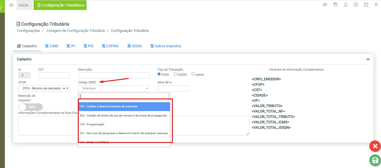 Código SPED – Selecione o Código SPED dentre as opções disponíveis na listagem. O cadastro de Código SPED é realizado pelo usuário. Em caso de dúvidas, acesse a instrução Cadastro de SPED para mais informações.
