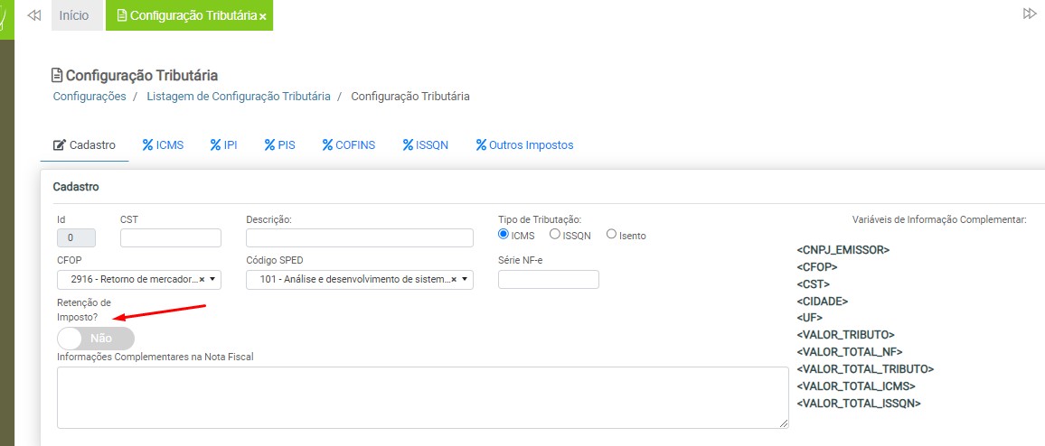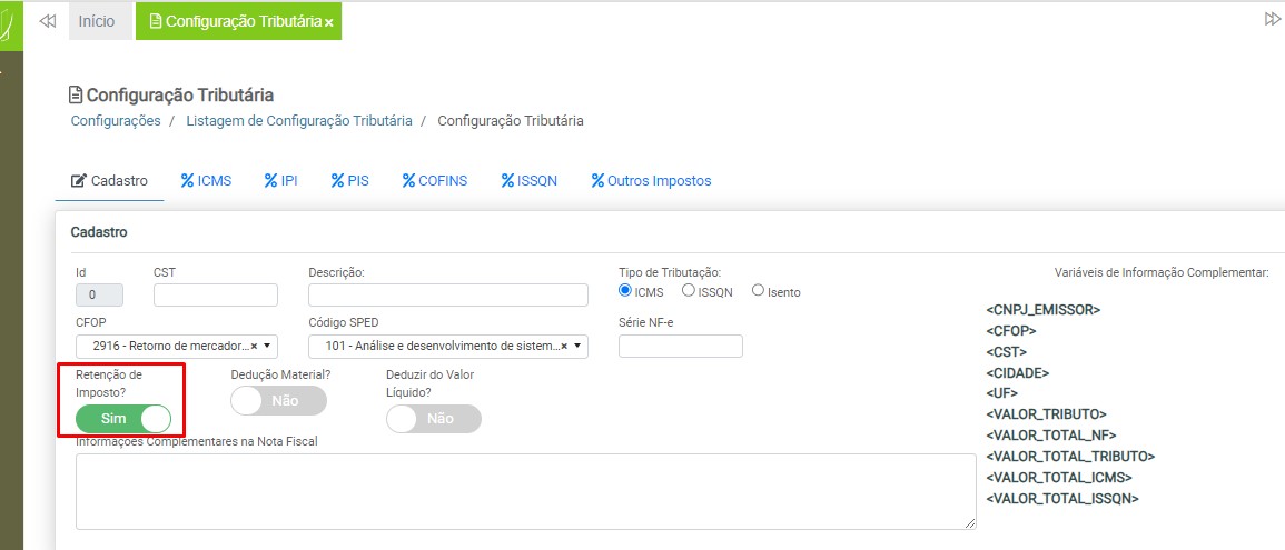 Retenção de Imposto – para ativar o recurso para retenção de imposto, clique no botão localizado abaixo do termo “Retenção de Imposto”.