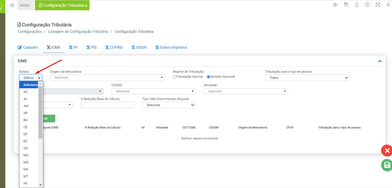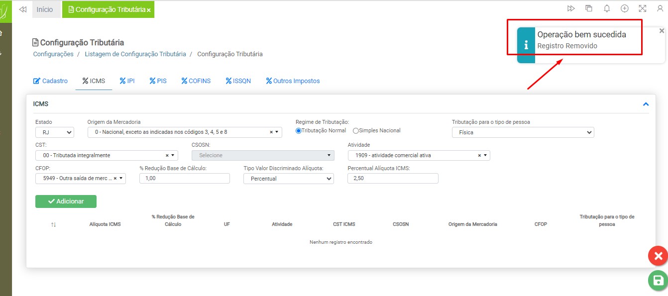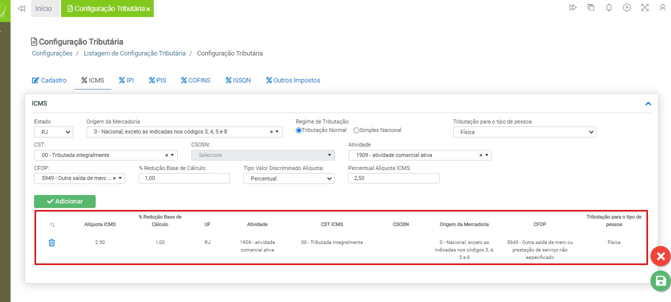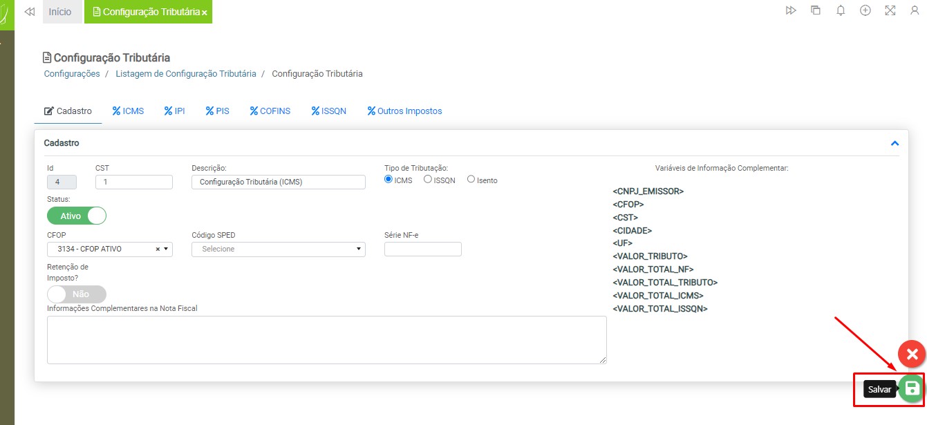 Após adicionar todos os dados necessários para a utilização da configuração tributária, clique no botão “Salvar”.
