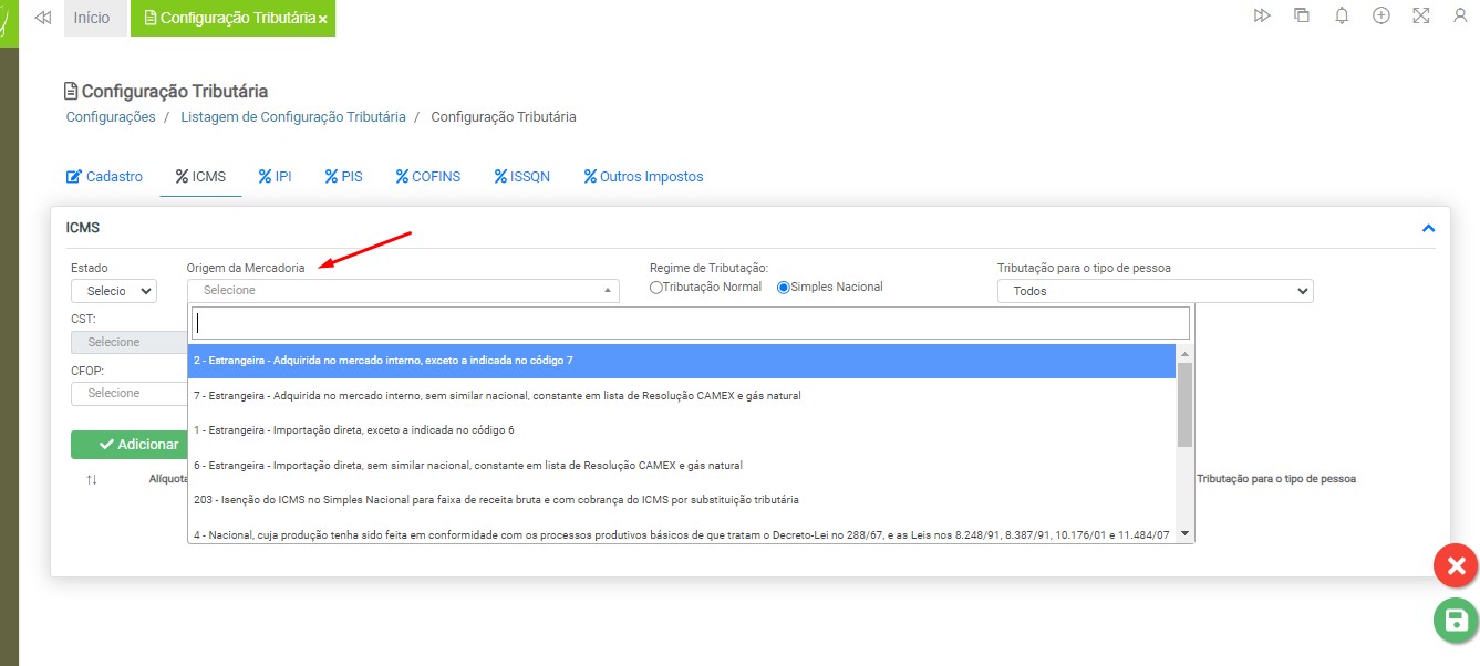 Origem da Mercadoria – Selecione a origem da mercadoria entre as opções disponíveis na listagem. O cadastro de origem da mercadoria é realizado pelo usuário. Em caso de dúvidas, acesse a instrução Cadastro de Origem da Mercadoria para mais informações.