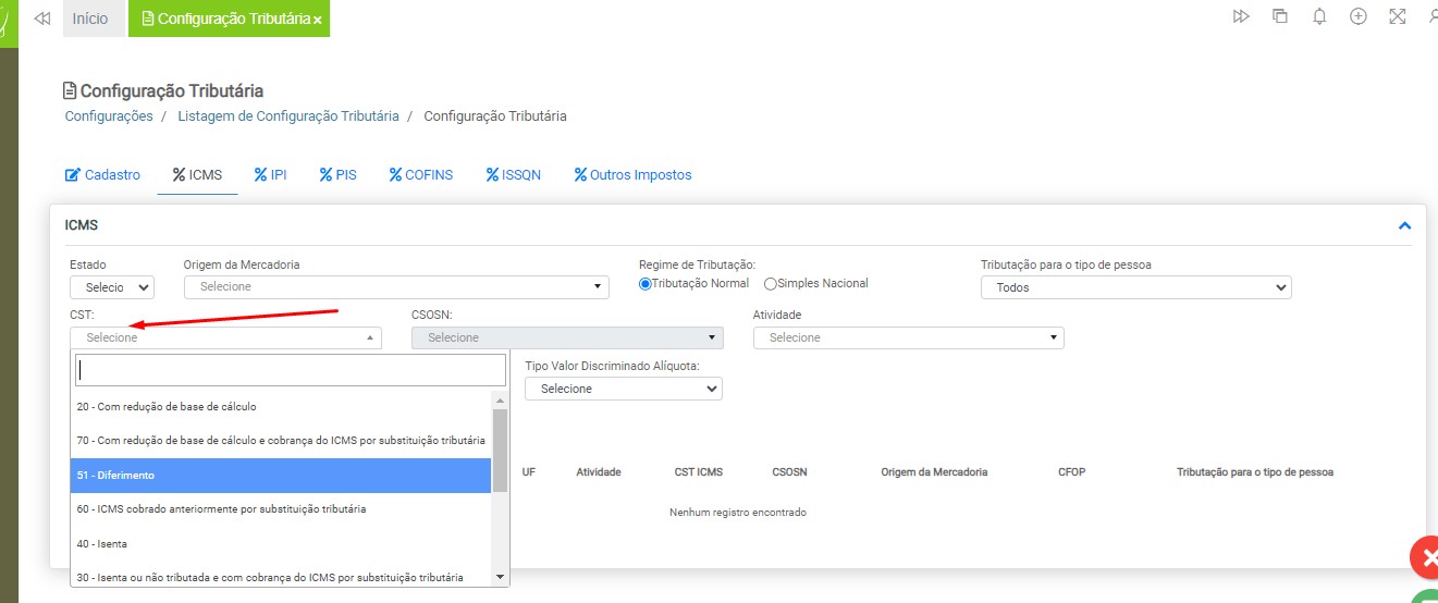 CST – Selecione o CST ICMS entre as opções disponíveis na listagem. O cadastro de CST ICMS é realizado pelo usuário. Em caso de dúvidas, acesse a instrução Cadastro de CST ICMS para mais informações.
