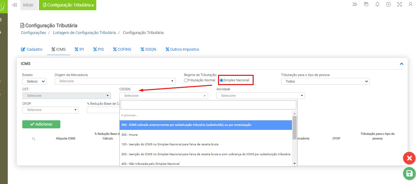 Observação: A seleção de cadastros CSOSN estará disponível quando o usuário marcar a opção “Simples Nacional” no recurso chamado “Regime de Tributação”.