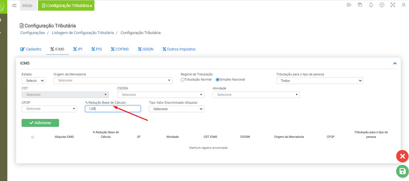 Redução Base de Cálculo – o campo de redução por base de cálculo está configurado em porcentagem. Caso utilize esta configuração, certifique-se de que o campo será preenchido adequadamente, inserindo todas as casas decimais.