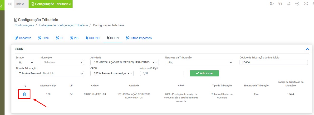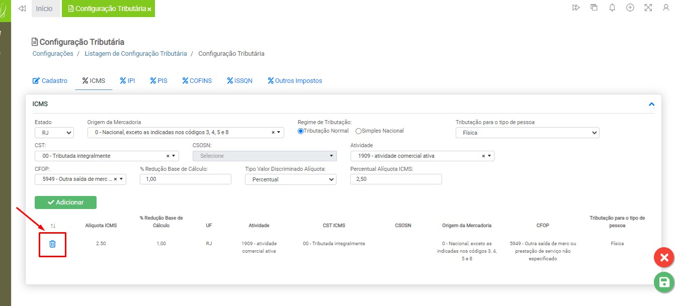 Caso necessite excluir os dados inseridos, clique no ícone da lixeira, localizado ao lado esquerdo da configuração inserida.