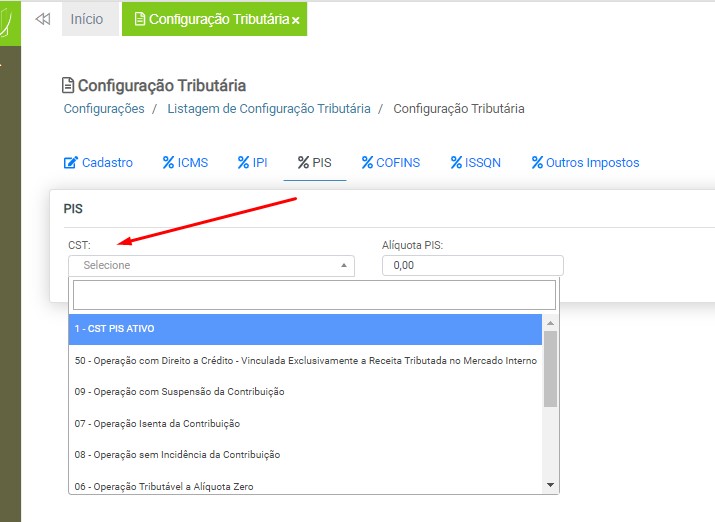 CST – Selecione o CST PIS entre as opções disponíveis na listagem. O cadastro de CST PIS é realizado pelo usuário. Em caso de dúvidas, acesse a instrução Cadastro de CST PIS para mais informações.