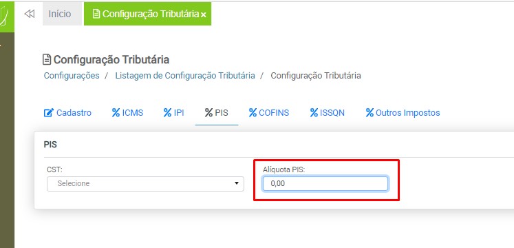 Alíquota PIS – Digite o percentual de alíquota para o PIS.