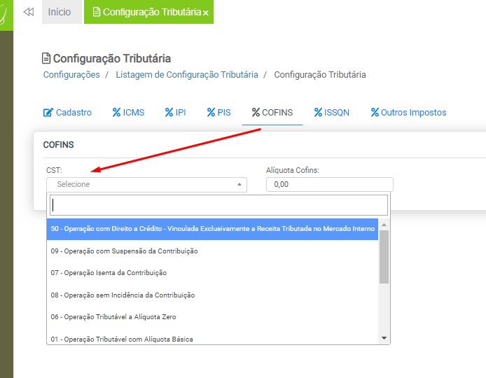CST – Selecione o CST COFINS entre as opções disponíveis na listagem. O cadastro de CST COFINS é realizado pelo usuário. Em caso de dúvidas, acesse a instrução Cadastro de CST COFINS para mais informações.