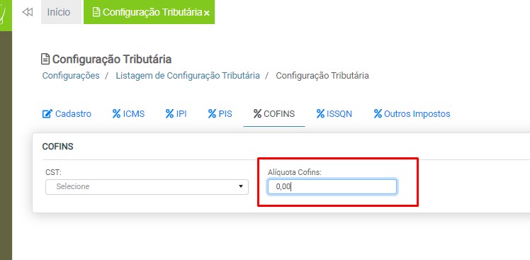Alíquota COFINS – Digite o percentual de alíquota para o COFINS.