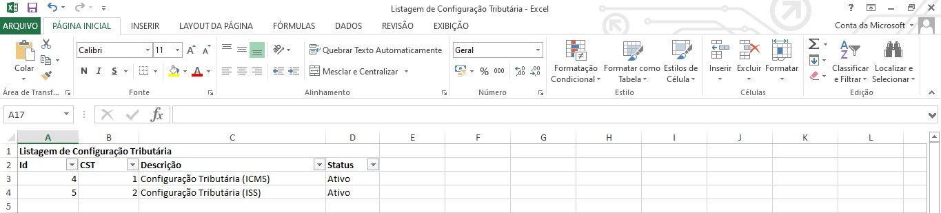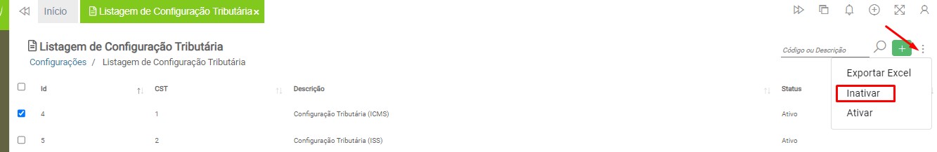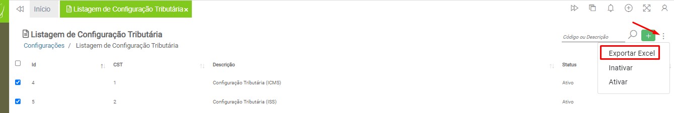 Para exportar a configuração tributária para Excel, acesse novamente o caminho Configurações > Grupo Fiscal > Configuração Tributária e marque a caixa de seleção, localizada do lado esquerdo do registro desejado.