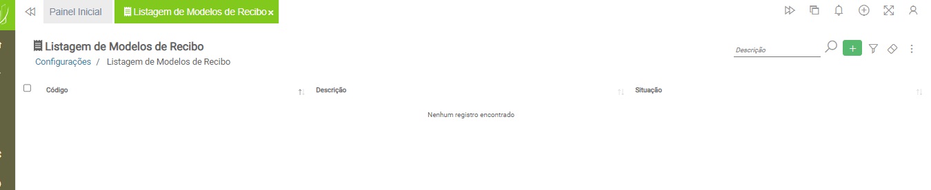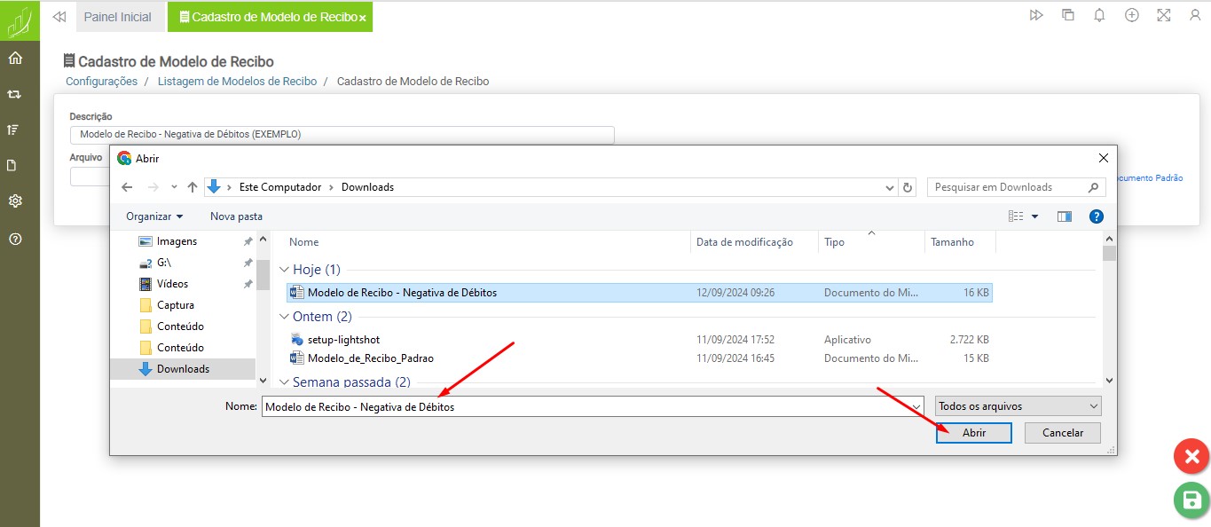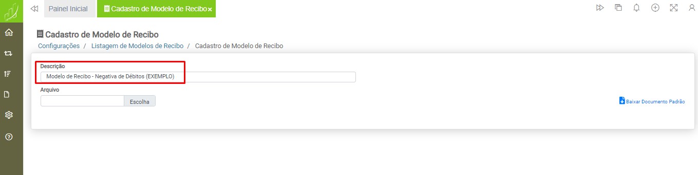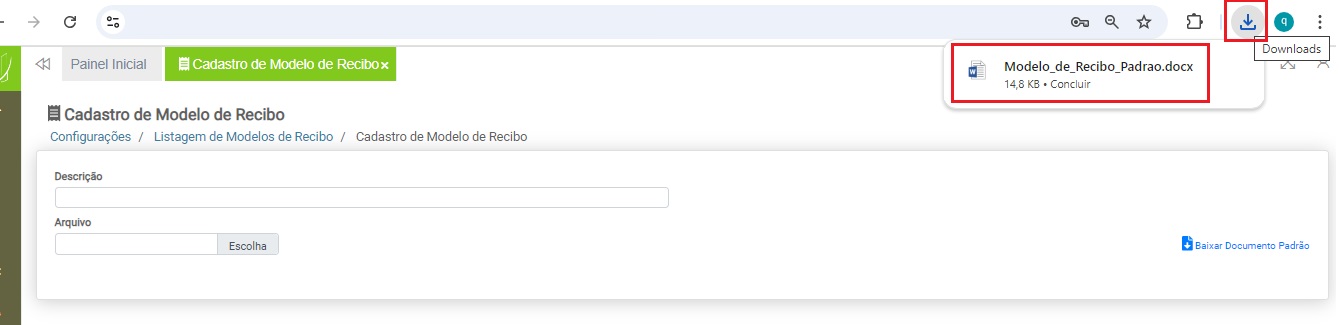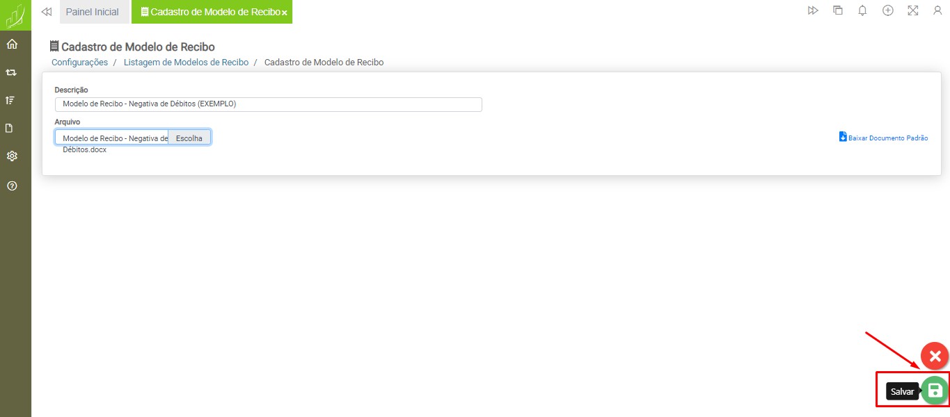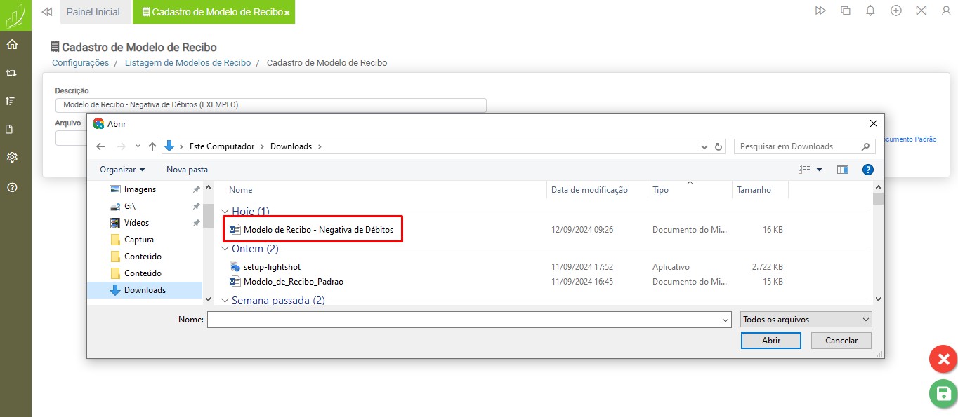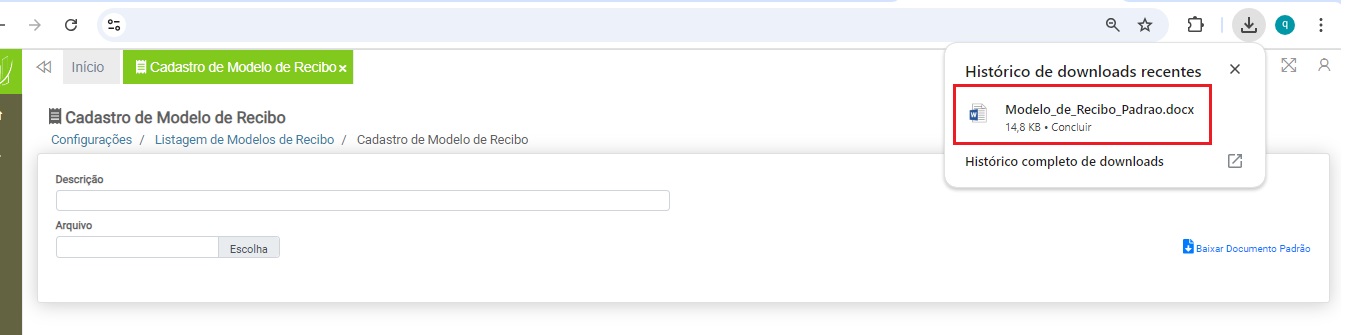 Retorne ao sistema, através do caminho Configurações > Modelo de Recibo, e clique novamente no botão “Incluir”, caso tenha saído da tela onde foi feito o download do recibo.