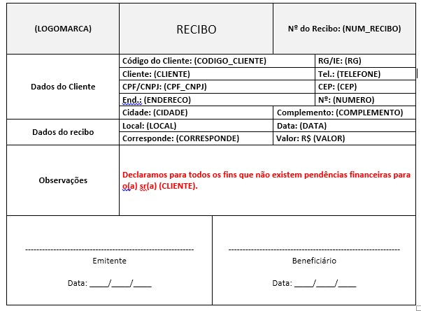 Exemplo: para emissão de um recibo de quitação anual de débitos, se o usuário inserir um texto declarando que o “cliente final não possui débitos junto à empresa” no campo de Observações, esta declaração será exibida toda vez em que este recibo for emitido.