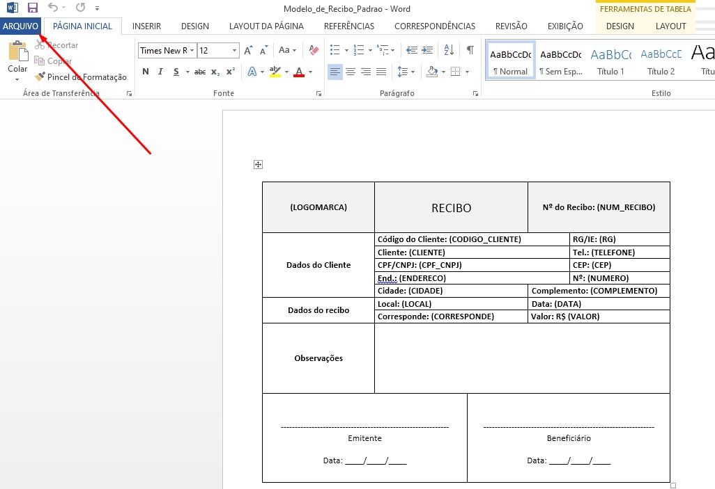 Para abrir o documento, clique no arquivo chamado “Modelo_de_Recibo_Padrao.docx”.