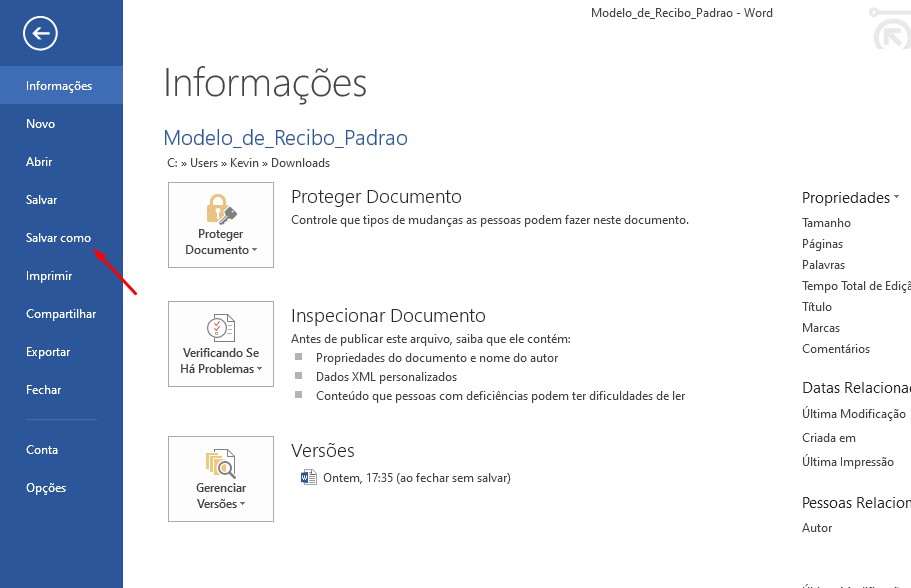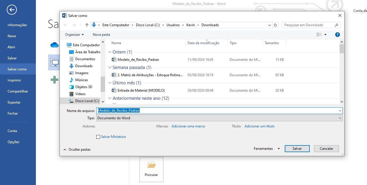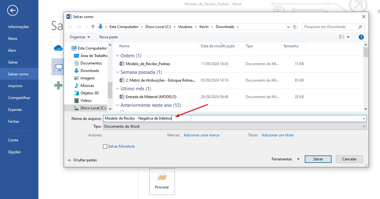 Em seguida, altere o nome do recibo/arquivo Word, para uma melhor identificação e para facilitar a busca do arquivo em sem computador.