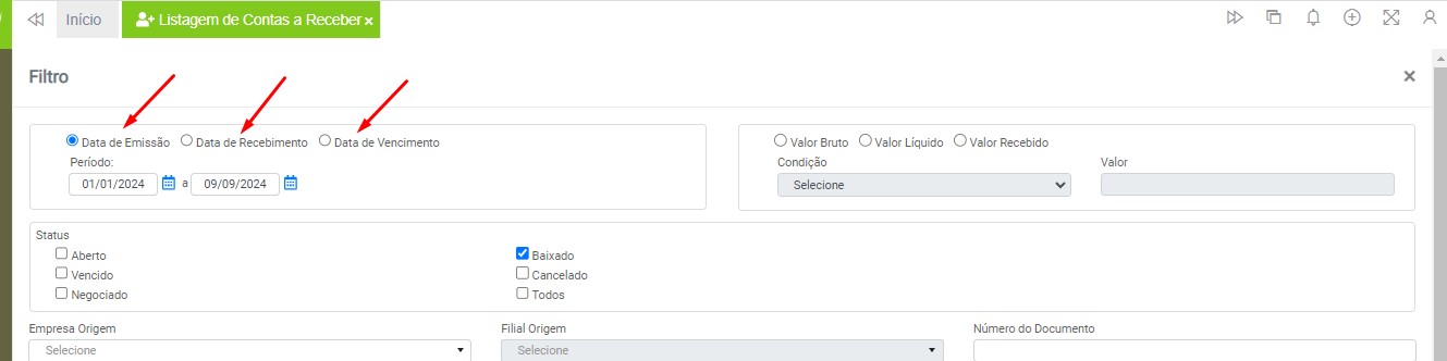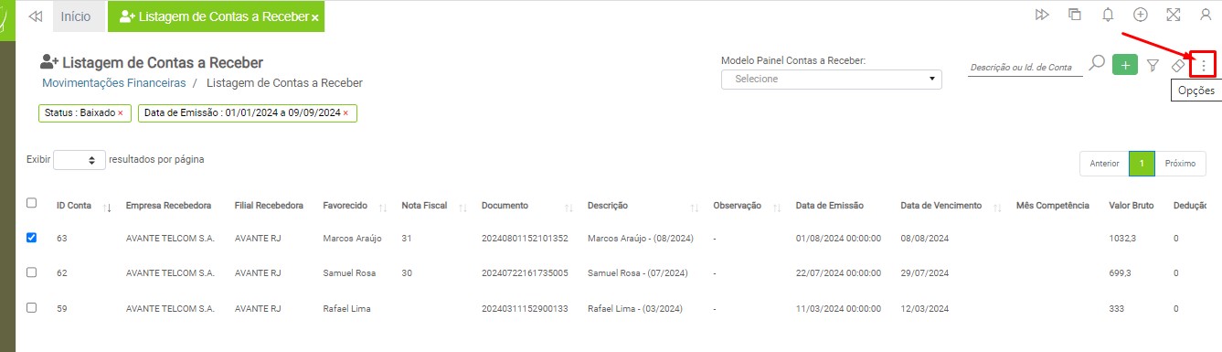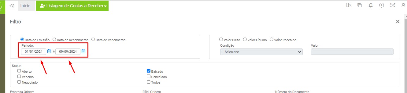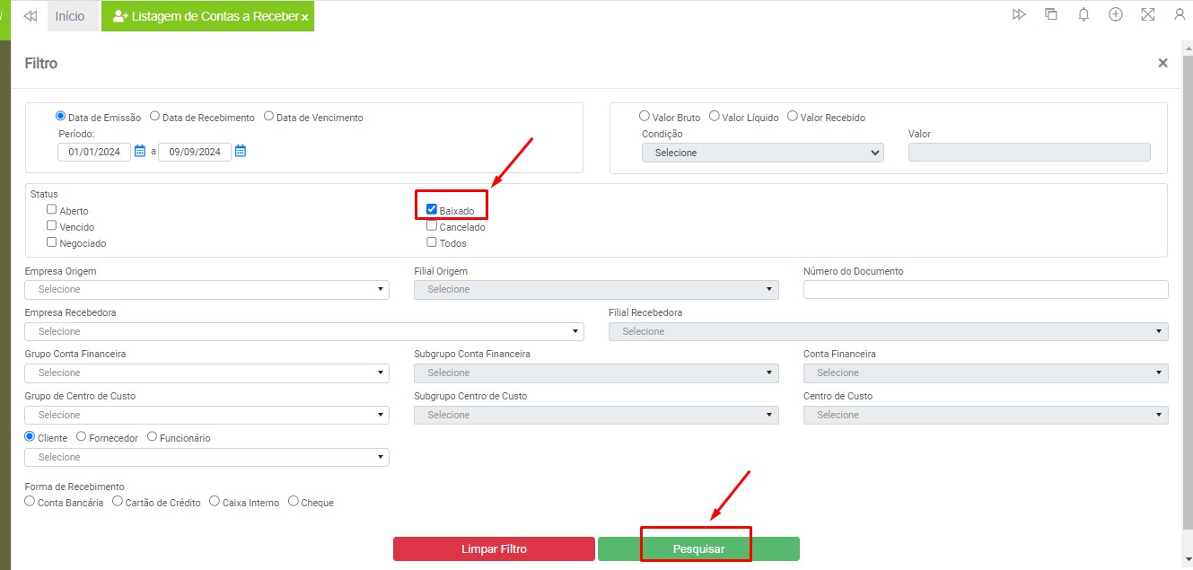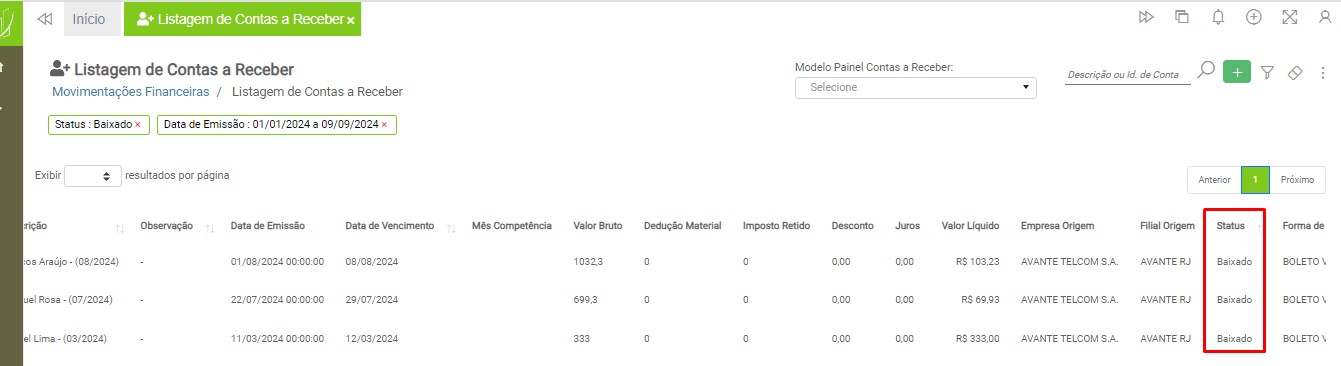 O próximo passo será realizar o filtro para o Aniel EVA exibir as contas a receber com status “Baixado”.
