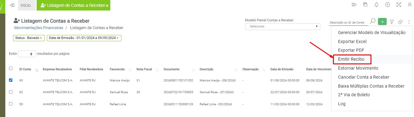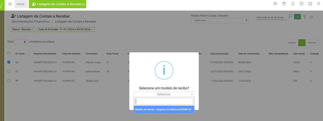 O Aniel EVA somente emite recibos para contas com status "Baixado".