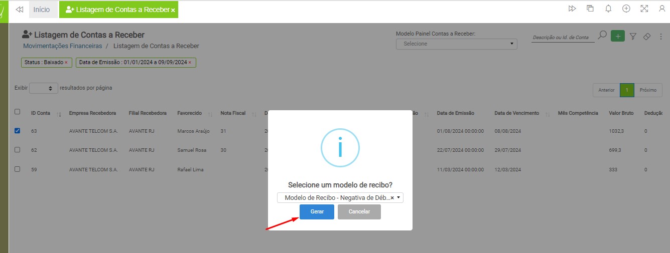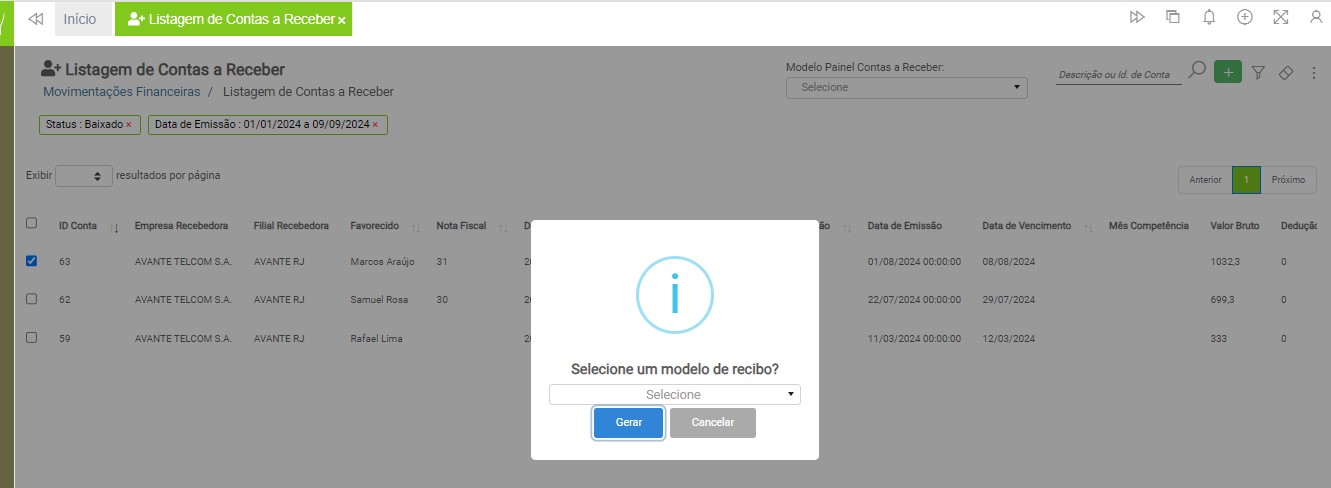 Em seguida, selecione a conta a receber que será utilizada para emissão do recibo, clicando na caixa de seleção, do lado esquerdo da conta a receber: