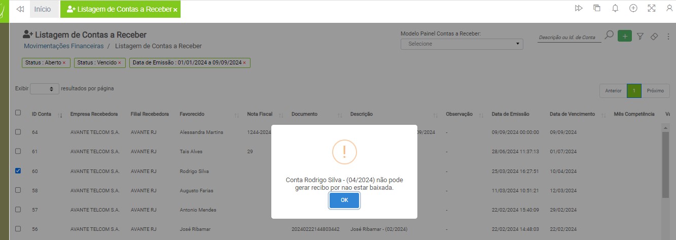 Caso tente emitir recibo para uma conta a receber com status “Aberto”, o sistema não permitirá esta ação e exibirá a seguinte mensagem: