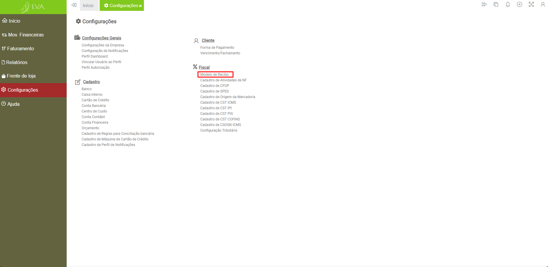 Em seguida o Aniel EVA abrirá uma caixa de seleção, e o modelo de recibo deverá ser selecionado.