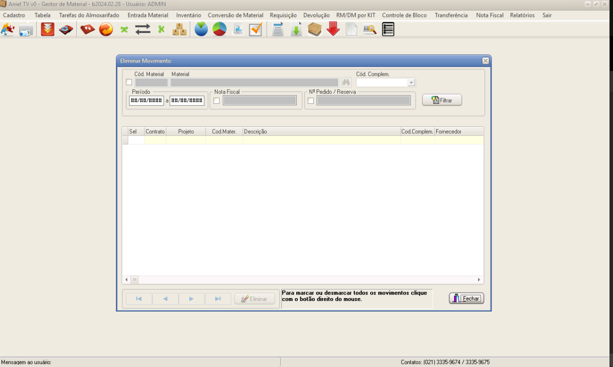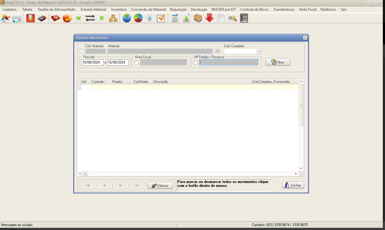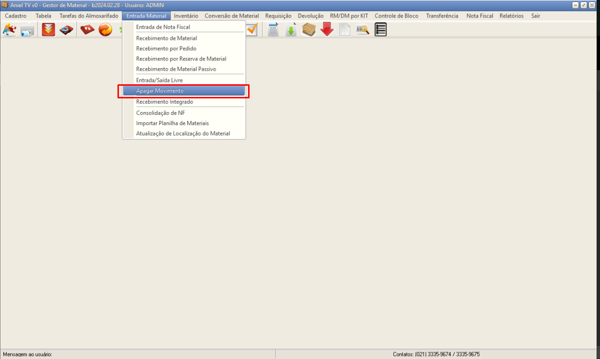 Aniel T5 > Módulo Gestor de Materiais > Entrada Material > Apagar Movimento