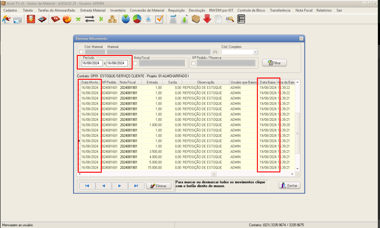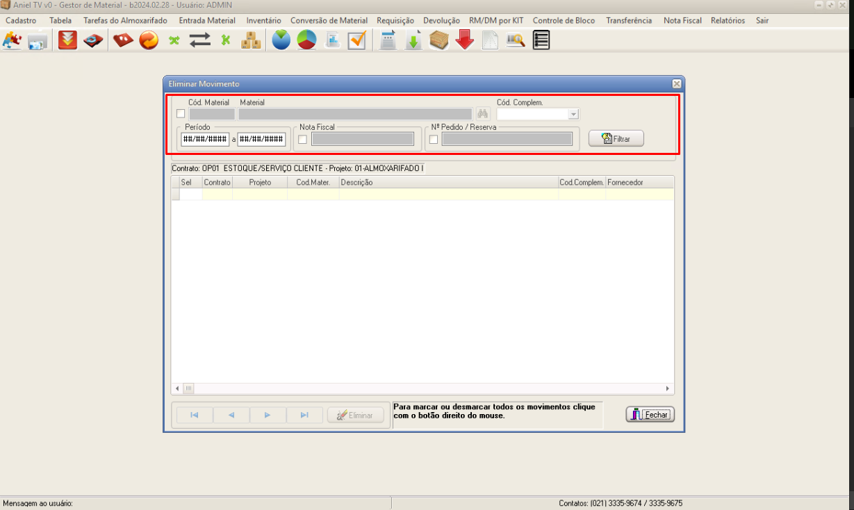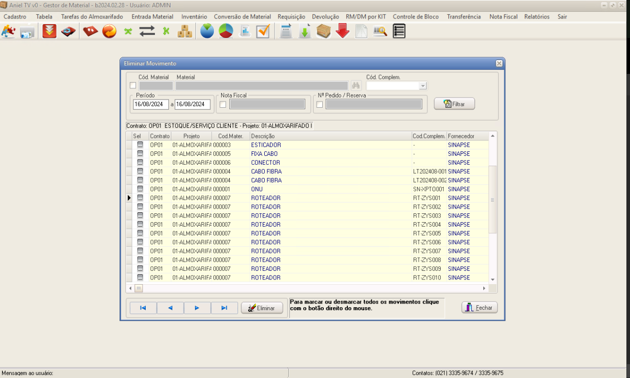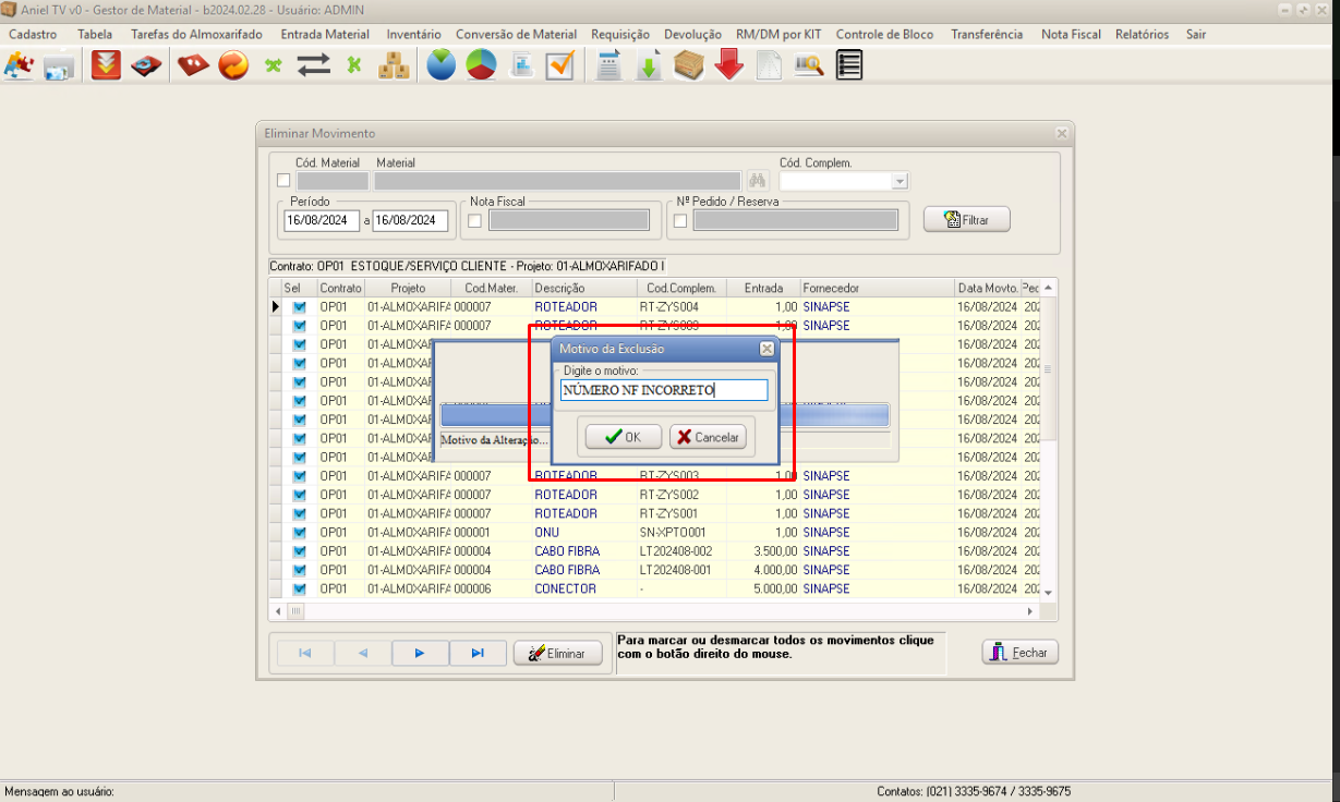Aniel T5 > Módulo Gestor de Materiais > Entrada Material > Apagar Movimento