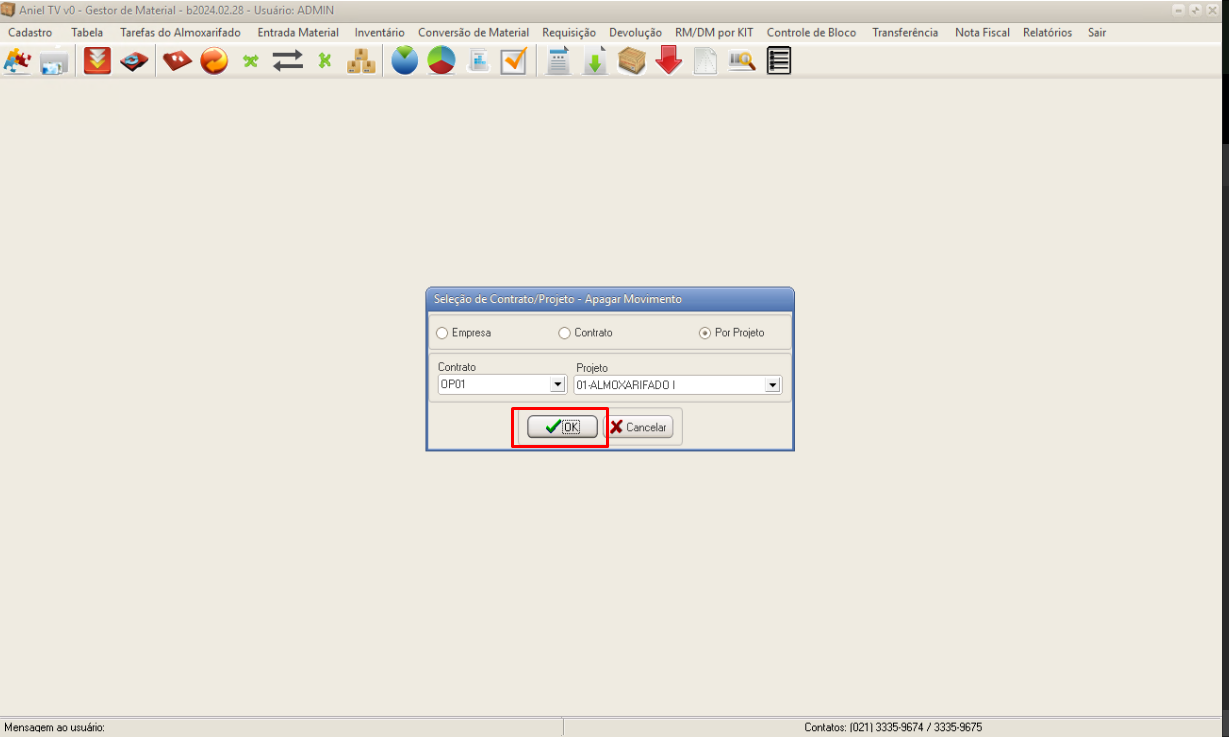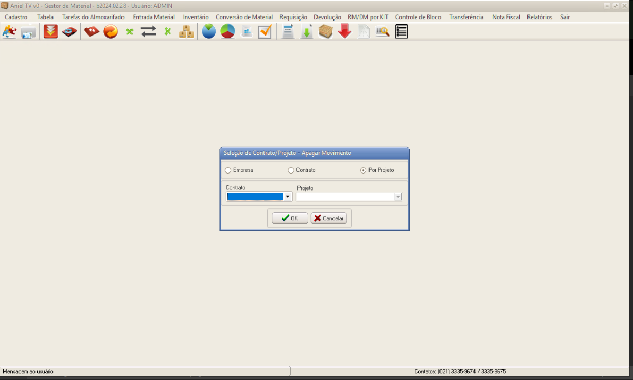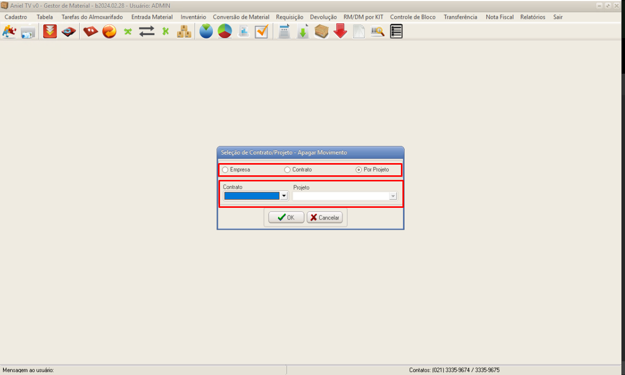 Caso realize um dos filtros de Contrato ou Projeto, selecione onde foi registrado movimento de entrada e clique no botão OK.