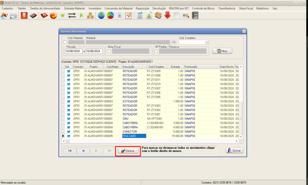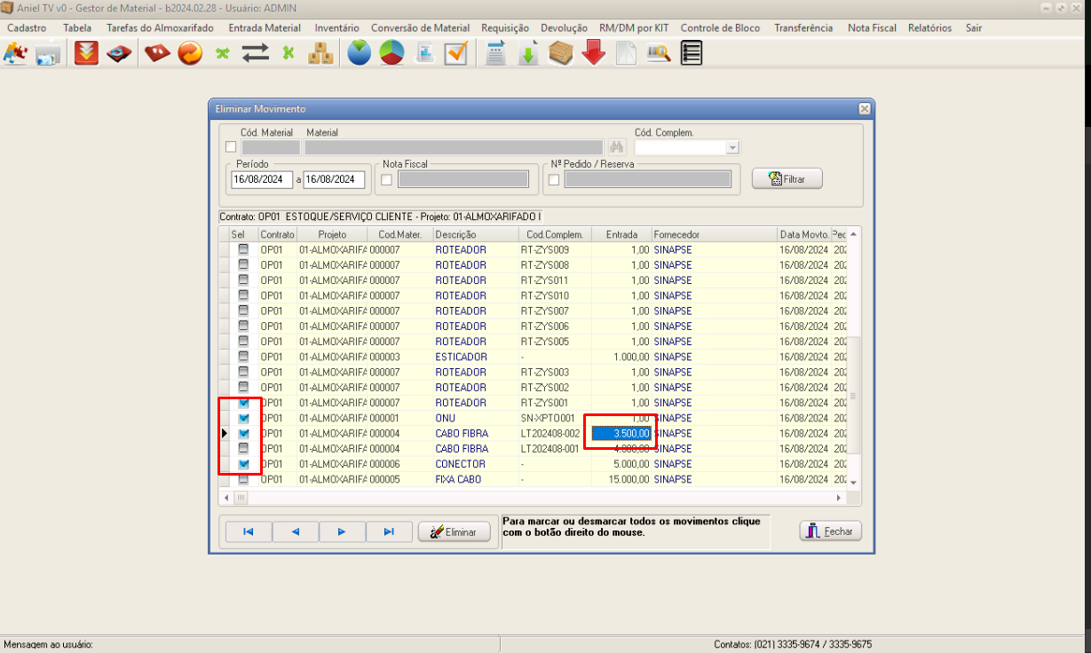 Na coluna Sel., selecione os registros que necessitam ser apagados. Caso se trate de quantidade incorreta, note que o Aniel não permite a edição da quantidade, pois o registro deve ser apagado e depois reinserido com as informações corretas.
