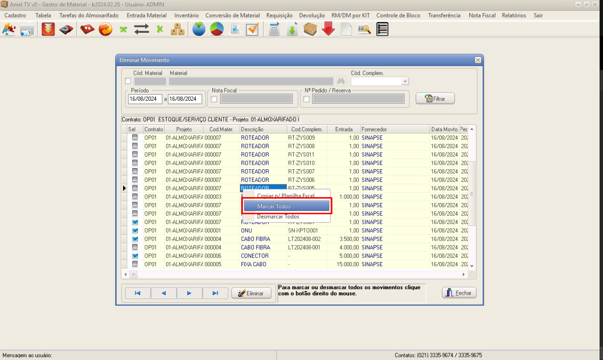 O Aniel também permite selecionar todos os registros, acessando o Menu de Contexto e selecionando a opção Marcar Todos.