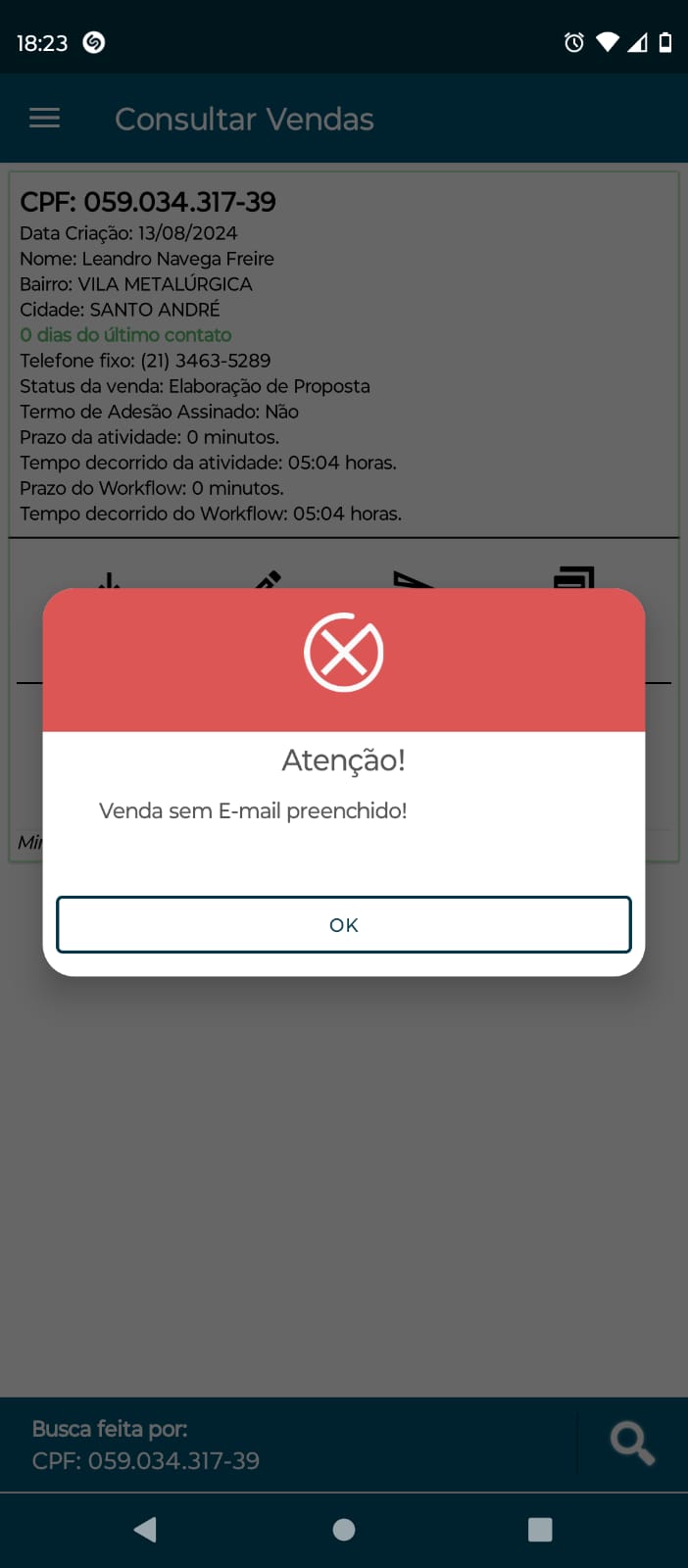 Enviar Termo: permite enviar o termo de adesão para o e-mail do cliente. Mas é necessário que o e-mail tenha sido informado no cadastro de venda, senão uma crítica surgirá na tela;