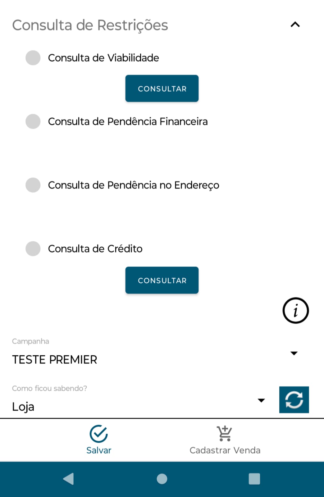 A última seção é dedicada a realizar o mesmo processo da Consulta de Viabilidade no Cadastro de Venda: