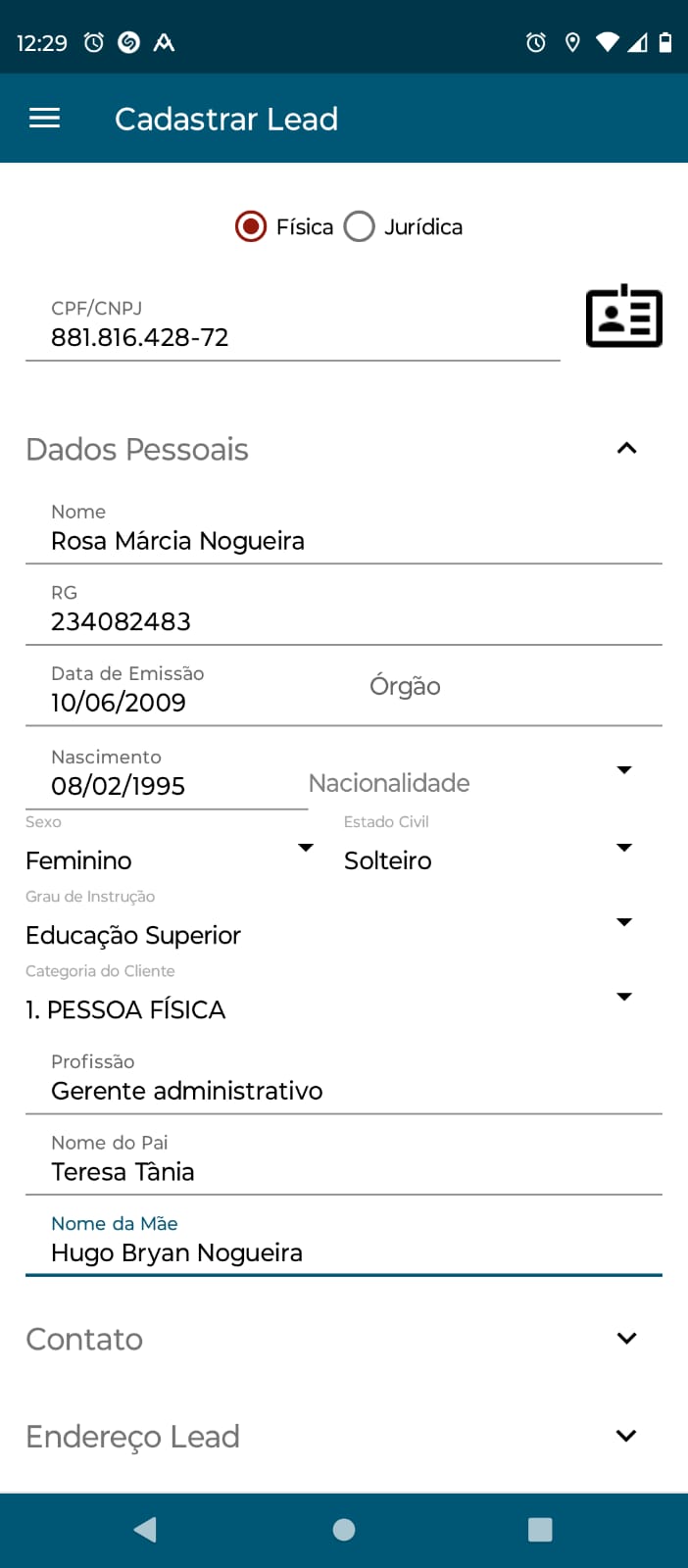 A primeira seção corresponde às informações dedicadas a nome, documentação e outros detalhes como grau de instrução, profissão, estado civil e categoria do cliente: