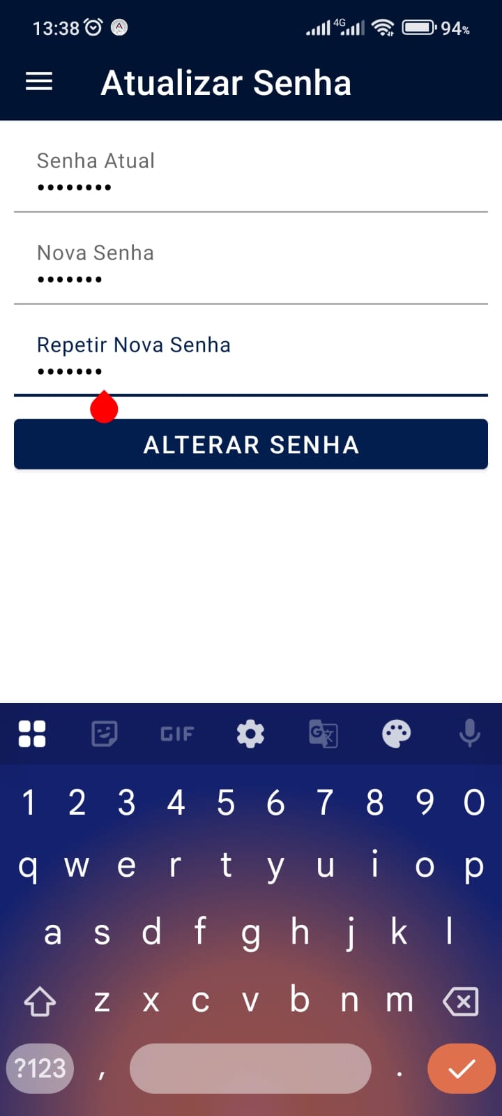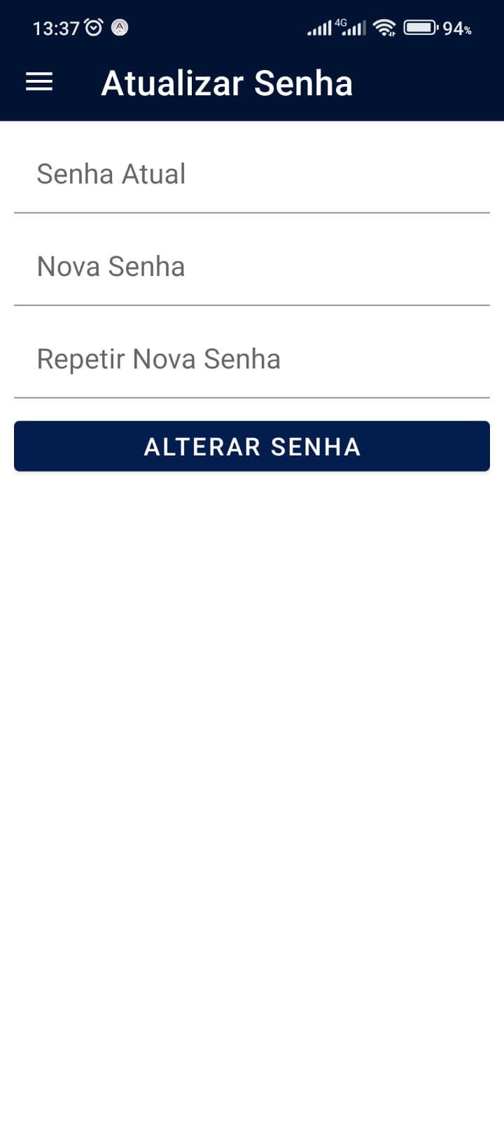 Na tela seguinte, preencha os campos com a senha atual, informe a nova senha e repita a nova senha.